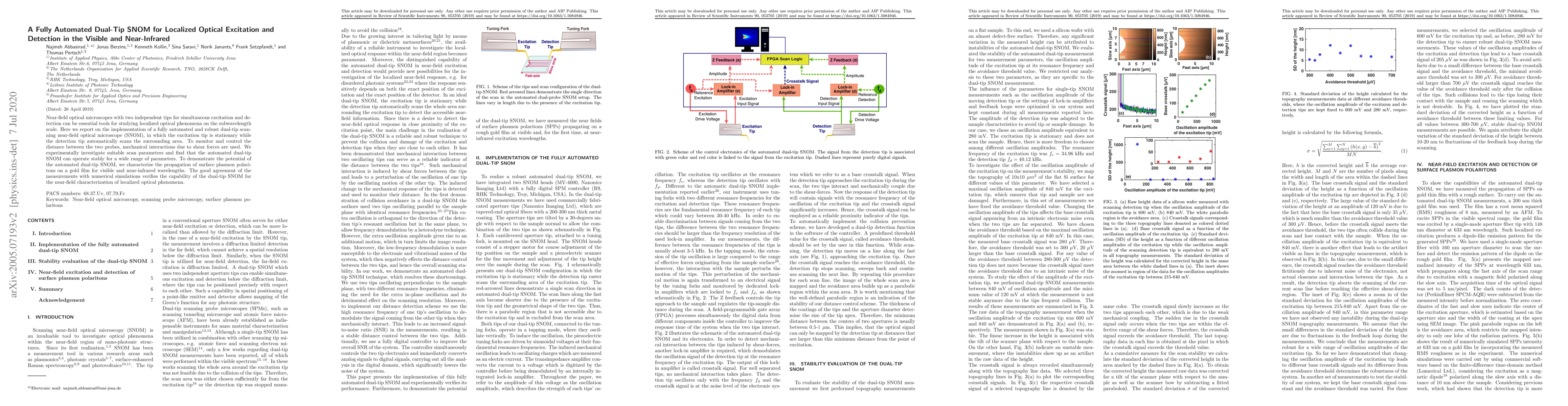 This research develops a fully automated dual-tip scanning near-field optical microscope (SNOM) for localized optical excitation and detection, demonstrating its stability and capability through the study of surface plasmon polaritons on gold at visible and near-infrared wavelengths, corroborated by numerical simulations.
