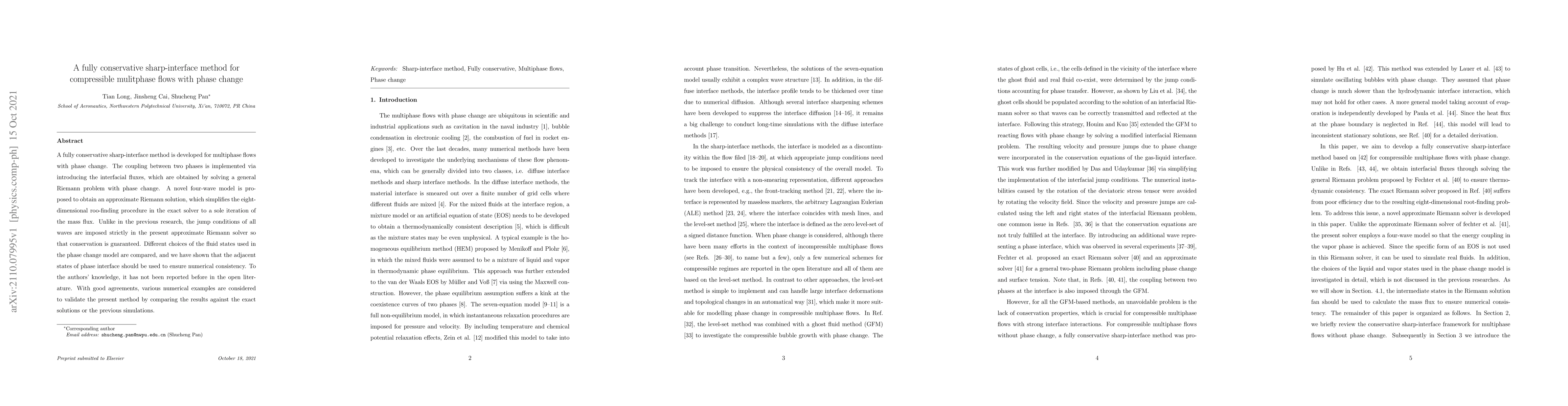 This paper develops a fully conservative sharp-interface method for compressible multiphase flows with phase change, utilizing a novel four-wave model to simplify the Riemann solver and ensure strict conservation. The method is validated through numerical examples showing good agreement with exact solutions and previous simulations.