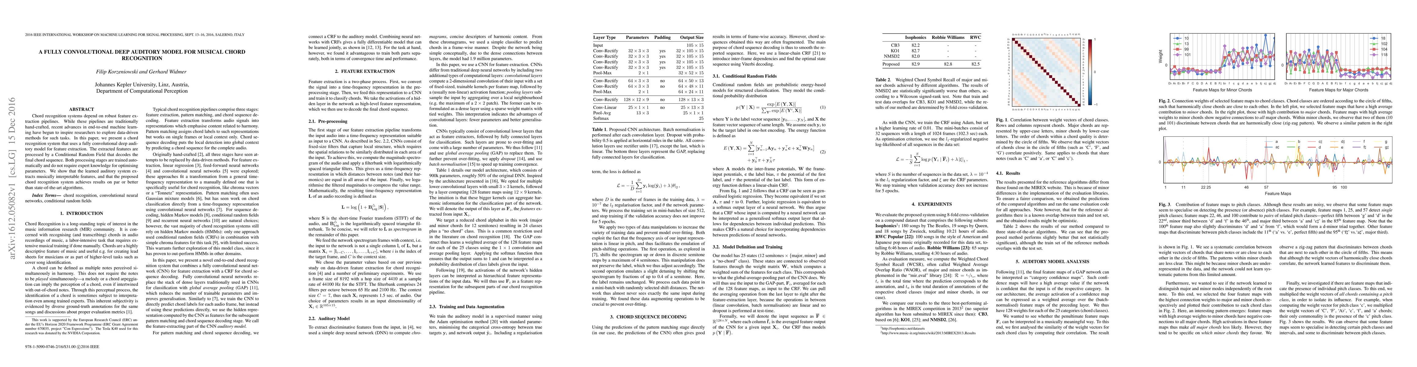 This paper introduces a fully convolutional deep auditory model for musical chord recognition, automatically extracting features and processing them via a Conditional Random Field, achieving results comparable to or surpassing state-of-the-art methods without needing expert-defined parameters.