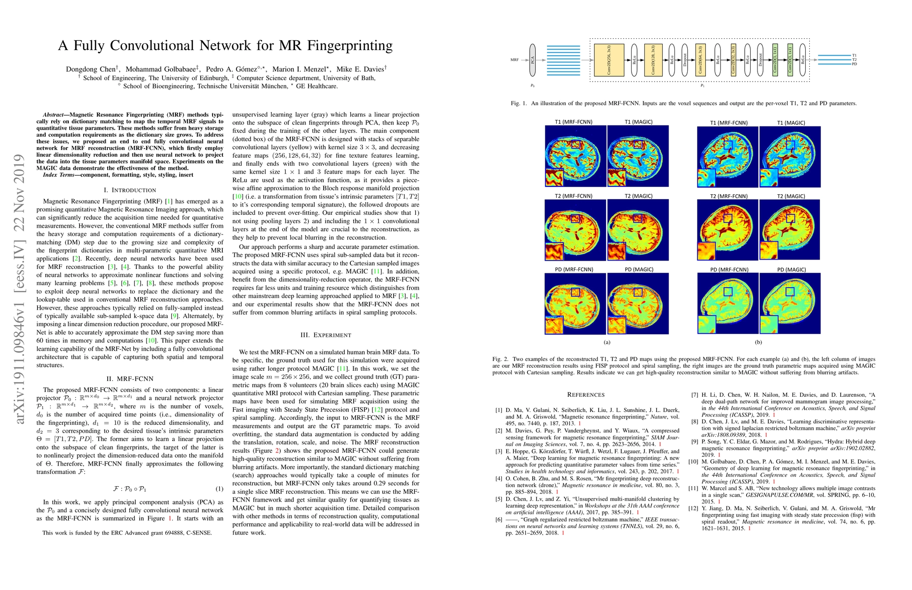 This paper proposes an end-to-end fully convolutional neural network (MRF-FCNN) for Magnetic Resonance Fingerprinting reconstruction, addressing heavy storage and computation issues by using linear dimensionality reduction and neural projection into tissue parameters manifold space. Experiments show the method's effectiveness on MAGIC data.