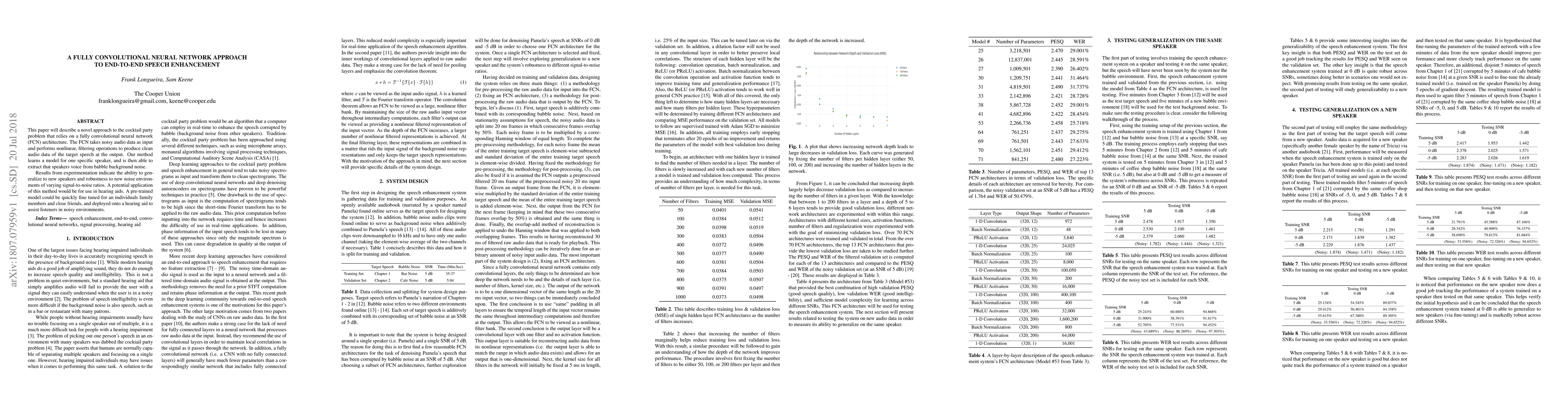 This paper will describe a novel approach to the cocktail party problem that relies on a fully convolutional neural network (FCN) architecture. The FCN takes noisy audio data as input and performs nonlinear, filtering operations to produce clean audio data of the target speech at the output. Our method learns a model for one specific speaker, and is then able to extract that speakers voice from babble background noise. Results from experimentation indicate the ability to generalize to new speakers and robustness to new noise environments of varying signal-to-noise ratios. A potential application of this method would be for use in hearing aids. A pre-trained model could be quickly fine tuned for an individuals family members and close friends, and deployed onto a hearing aid to assist listeners in noisy environments.