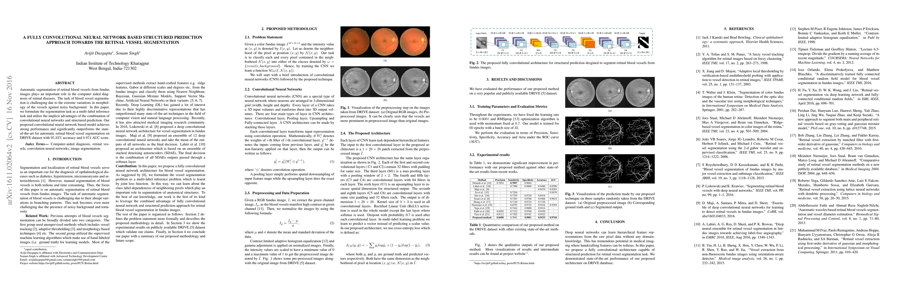 The paper proposes a fully convolutional neural network (FCN) architecture for retinal blood vessel segmentation, formulated as a multi-label inference problem. It utilizes structured prediction to learn class label dependencies of neighboring pixels, leveraging the combined advantages of FCNs and structured prediction for retinal blood vessel segmentation in fundus images.