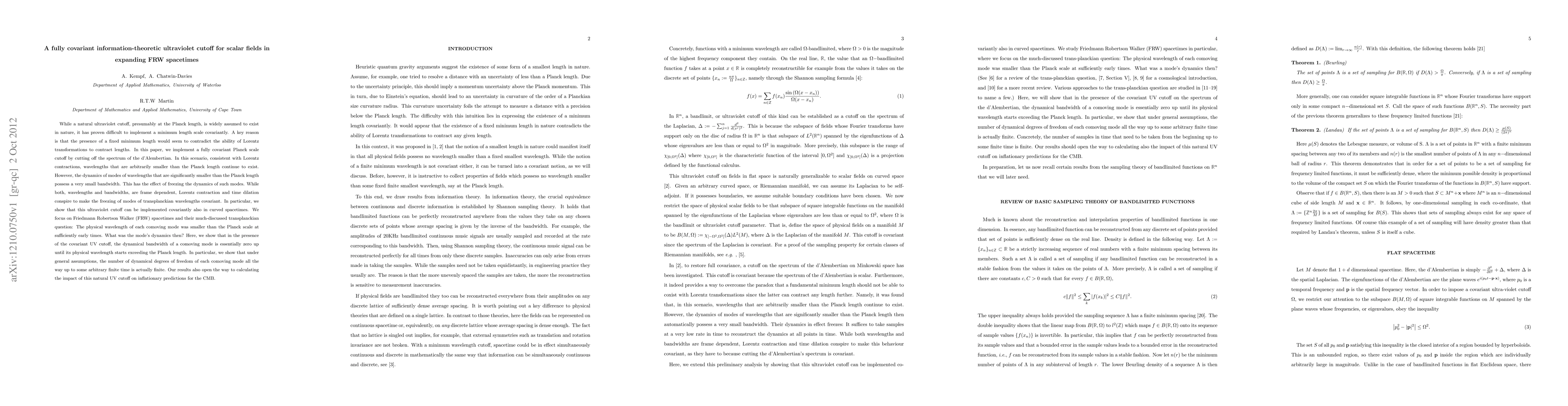 This paper presents a fully covariant ultraviolet cutoff for scalar fields in expanding FRW spacetimes, freezing the dynamics of modes with wavelengths significantly smaller than the Planck length. This approach maintains consistency with Lorentz transformations and allows for finite dynamical degrees of freedom in early universe scenarios.