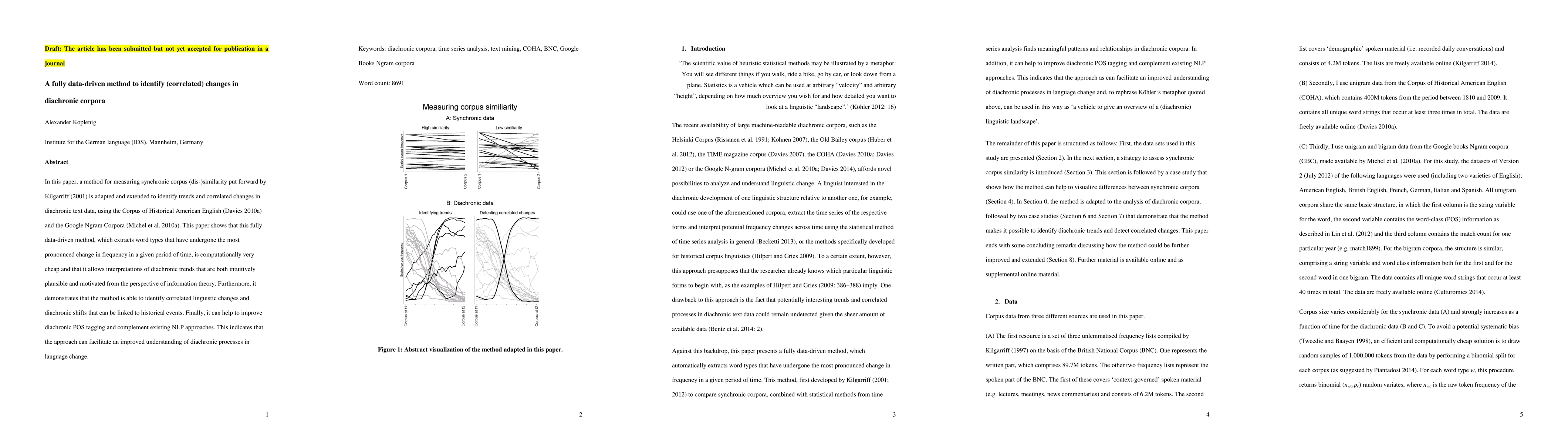 In this paper, a method for measuring synchronic corpus (dis-)similarity put forward by Kilgarriff (2001) is adapted and extended to identify trends and correlated changes in diachronic text data, using the Corpus of Historical American English (Davies 2010a) and the Google Ngram Corpora (Michel et al. 2010a). This paper shows that this fully data-driven method, which extracts word types that have undergone the most pronounced change in frequency in a given period of time, is computationally very cheap and that it allows interpretations of diachronic trends that are both intuitively plausible and motivated from the perspective of information theory. Furthermore, it demonstrates that the method is able to identify correlated linguistic changes and diachronic shifts that can be linked to historical events. Finally, it can help to improve diachronic POS tagging and complement existing NLP approaches. This indicates that the approach can facilitate an improved understanding of diachronic processes in language change.