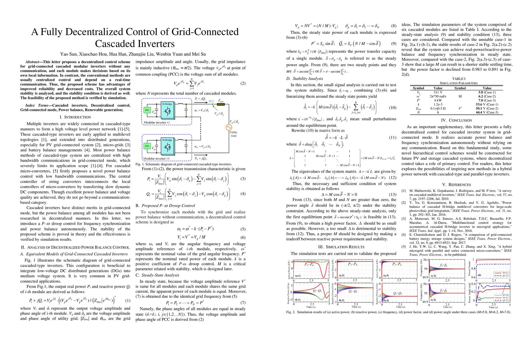 This paper introduces a fully decentralized control scheme for grid-connected cascaded modular inverters, enabling each module to operate independently based on local data. This approach enhances reliability and reduces costs compared to centralized methods, and stability conditions are derived and verified through simulations.