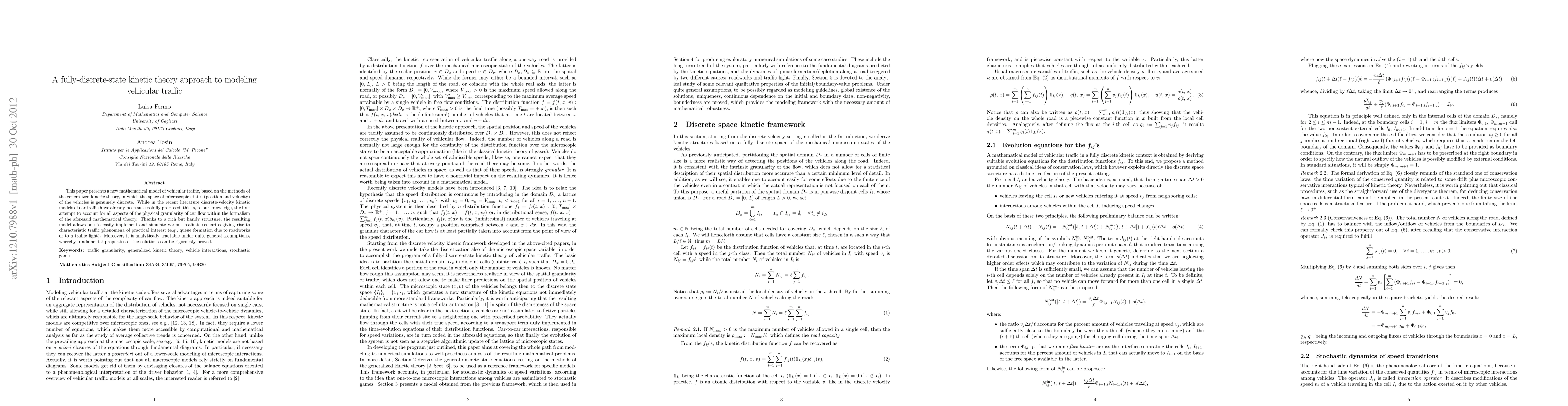 This paper introduces a novel fully-discrete-state kinetic theory model for vehicular traffic, capturing the physical granularity of car flow. It allows for the simulation of realistic traffic scenarios and proves fundamental properties analytically.