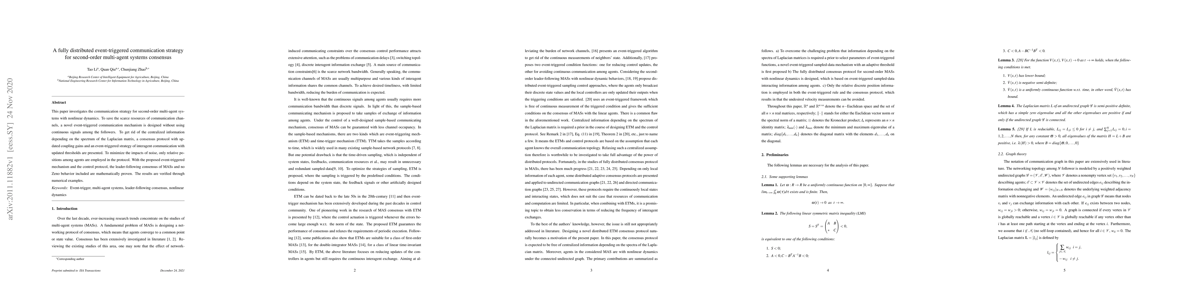This paper investigates the communication strategy for second-order multi-agent systems with nonlinear dynamics. To save the scarce resources of communication channels, a novel event-triggered communication mechanism is designed without using continuous signals among the followers. To get rid of the centralized information depending on the spectrum of the Laplacian matrix, a consensus protocol with updated coupling gains and an event-triggered strategy of interagent communication with updated thresholds are presented. To minimize the impacts of noise, only relative positions among agents are employed in the protocol. With the proposed event-triggered mechanism and the control protocol, the leader-following consensus of MASs and no Zeno behavior included are mathematically proven. The results are verified through numerical examples.