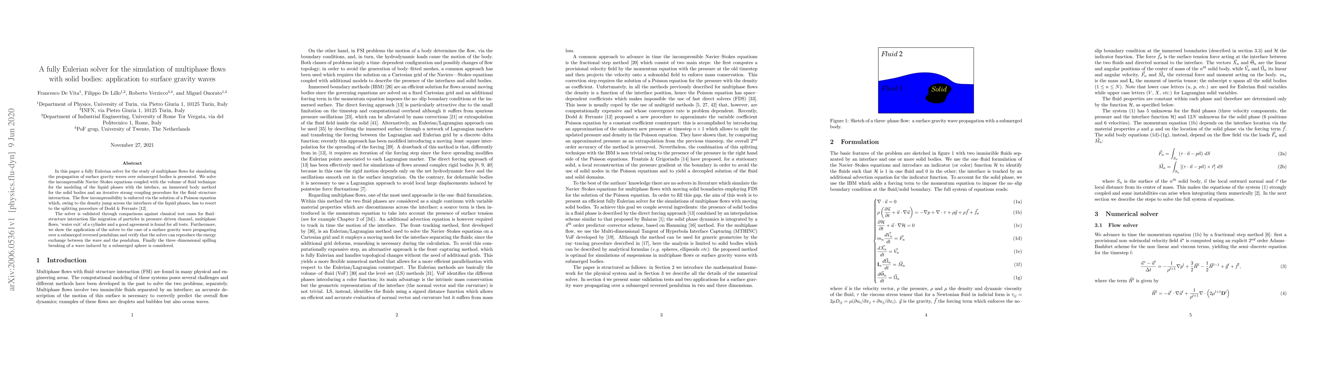 This paper presents a fully Eulerian solver for simulating multiphase flows, particularly focusing on surface gravity waves over submerged bodies. The solver uses the Navier-Stokes equations coupled with the volume of fluid method, immersed body technique, and strong-coupling procedure, validated through various fluid-structure interaction tests, including wave interactions with a reversed pendulum and a submerged sphere.