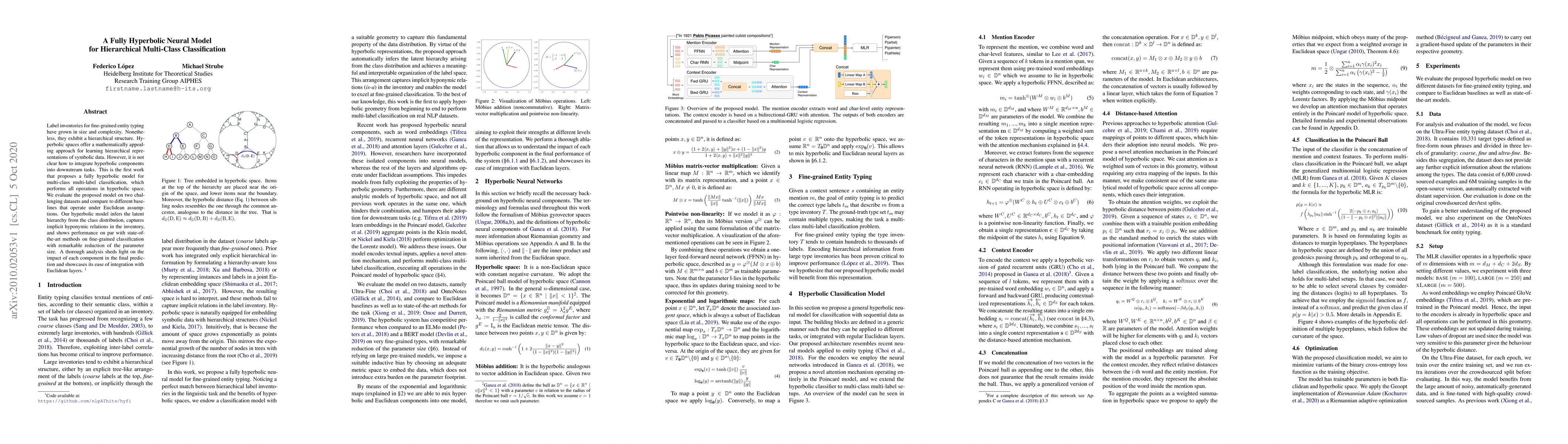 This paper proposes a fully hyperbolic neural model for hierarchical multi-class classification, leveraging hyperbolic spaces to learn representations that naturally capture the inherent hierarchy in label inventories. The model achieves competitive performance with reduced parameter size compared to Euclidean baselines.