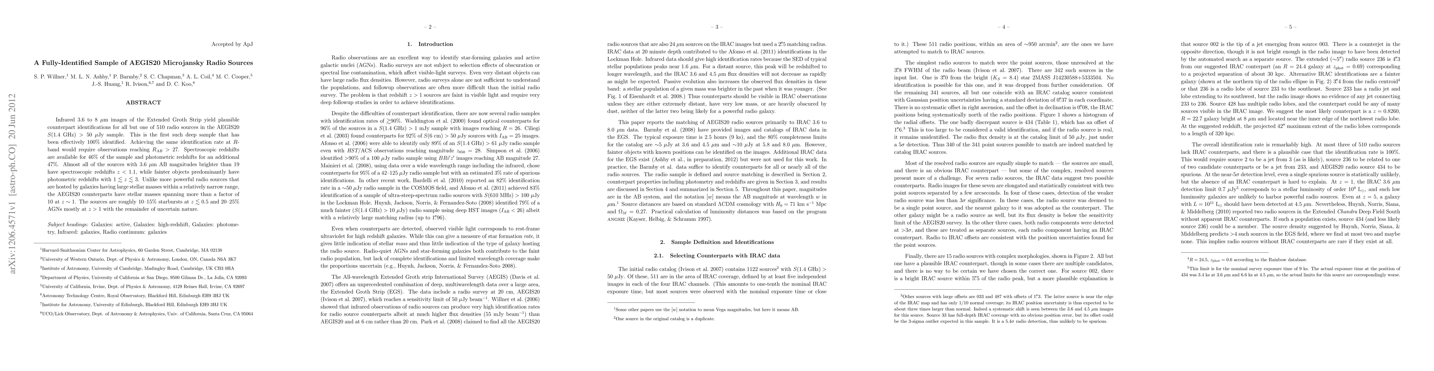 Infrared 3.6 to 8 micron images of the Extended Groth Strip yield plausible counterpart identifications for all but one of 510 radio sources in the AEGIS20 S(1.4 GHz) > 50 micro-Jy sample. This is the first such deep sample that has been effectively 100% identified. Achieving the same identification rate at R-band would require observations reaching R_AB > 27. Spectroscopic redshifts are available for 46% of the sample and photometric redshifts for an additional 47%. Almost all of the sources with 3.6 micron AB magnitudes brighter than 19 have spectroscopic redshifts z < 1.1, while fainter objects predominantly have photometric redshifts with 1 \lapprox z \lapprox 3. Unlike more powerful radio sources that are hosted by galaxies having large stellar masses within a relatively narrow range, the AEGIS20 counterparts have stellar masses spanning more than a factor of 10 at z \sim 1. The sources are roughly 10--15% starbursts at z \lapprox 0.5 and 20--25% AGNs mostly at z > 1 with the remainder of uncertain nature.