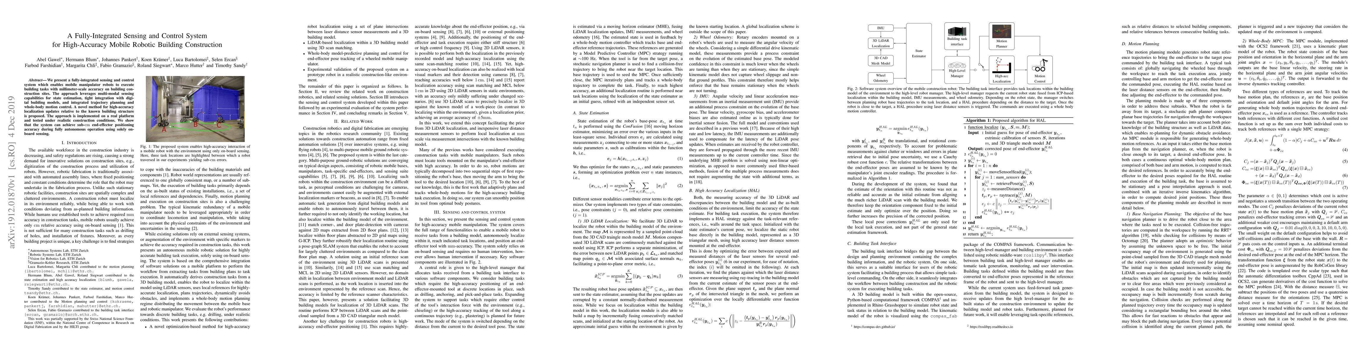 This paper introduces a fully-integrated sensing and control system for mobile robots to autonomously build structures with millimeter-scale precision. The system combines multi-modal sensing, digital building model integration, and advanced motion control, achieving sub-cm accuracy in positioning.
