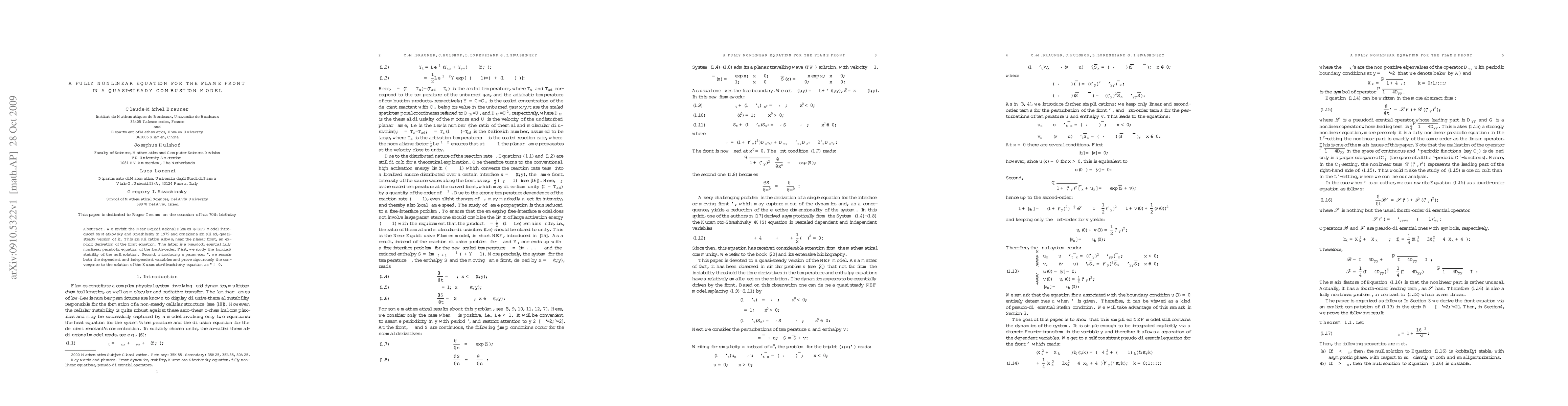 We revisit the Near Equidiffusional Flames (NEF) model introduced by Matkowsky and Sivashinsky in 1979 and consider a simplified, quasi-steady version of it. This simplification allows, near the planar front, an explicit derivation of the front equation. The latter is a pseudodifferential fully nonlinear parabolic equation of the fourth-order. First, we study the (orbital) stability of the null solution. Second, introducing a parameter $\epsilon$, we rescale both the dependent and independent variables and prove rigourously the convergence to the solution of the Kuramoto-Sivashinsky equation as $\epsilon\to 0$.
