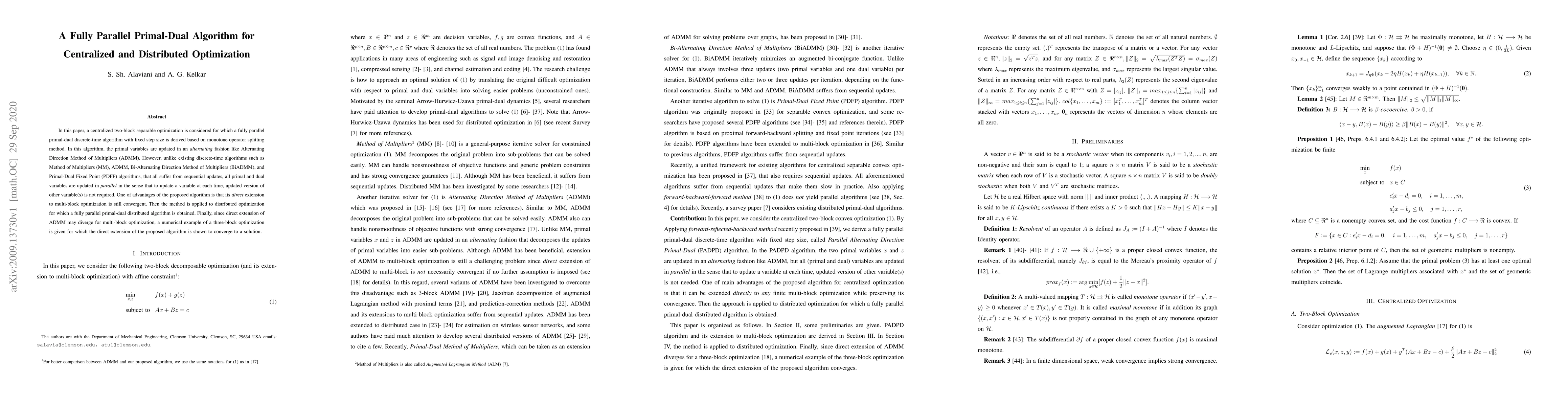 This paper proposes a fully parallel primal-dual algorithm for centralized and distributed optimization, enabling parallel updates of all variables without requiring sequential steps. The method extends to multi-block optimization and demonstrates convergence in a numerical example.