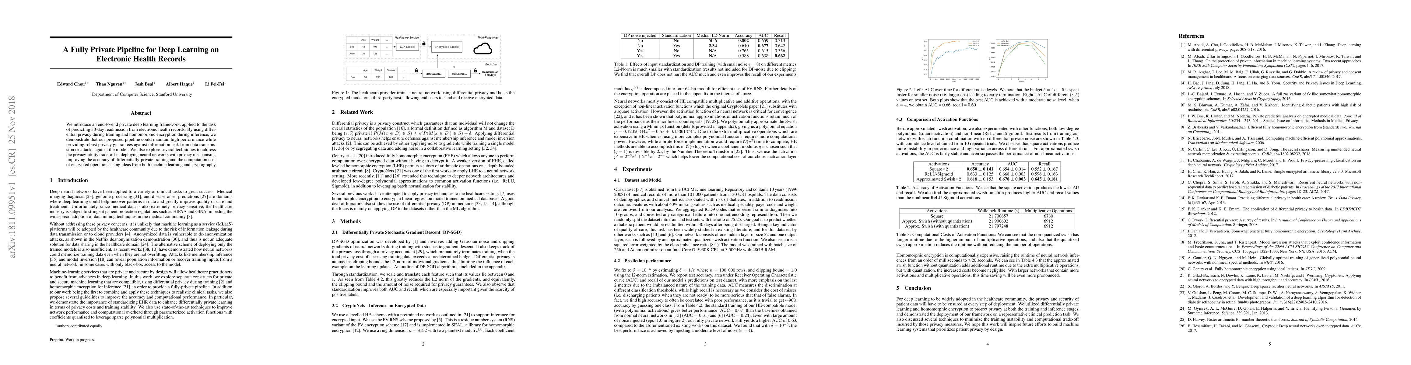 We introduce an end-to-end private deep learning framework, applied to the task of predicting 30-day readmission from electronic health records. By using differential privacy during training and homomorphic encryption during inference, we demonstrate that our proposed pipeline could maintain high performance while providing robust privacy guarantees against information leak from data transmission or attacks against the model. We also explore several techniques to address the privacy-utility trade-off in deploying neural networks with privacy mechanisms, improving the accuracy of differentially-private training and the computation cost of encrypted operations using ideas from both machine learning and cryptography.