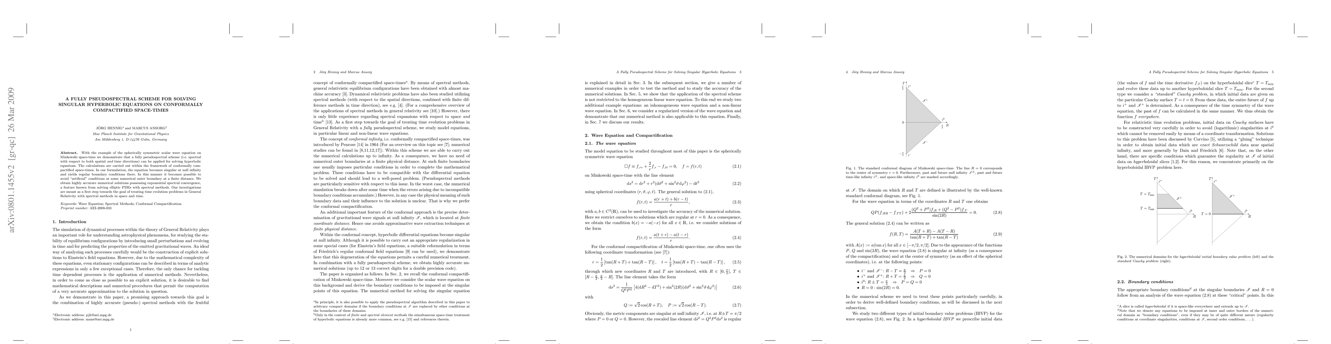 This research introduces a fully pseudospectral scheme for solving singular hyperbolic equations, exemplified by the scalar wave equation in Minkowski space-time. The method avoids artificial boundary conditions at finite distances by formulating the equation as singular at null infinity, achieving exponential spectral convergence in solutions.