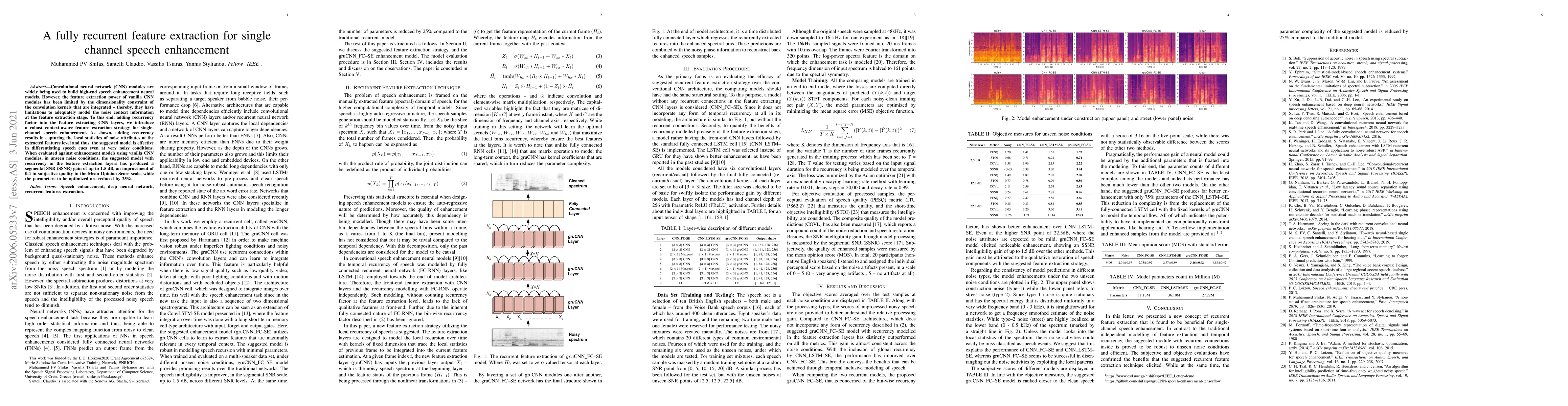 This research introduces a recurrent feature extraction method for enhancing single-channel speech, addressing the limitations of traditional convolutional neural networks (CNNs) in capturing noise context information. The proposed model, integrating recurrent layers with CNNs, demonstrates significant improvements in speech enhancement, achieving up to 1.5 dB higher segmental SNR and better subjective quality scores, while reducing the number of parameters by 25%.