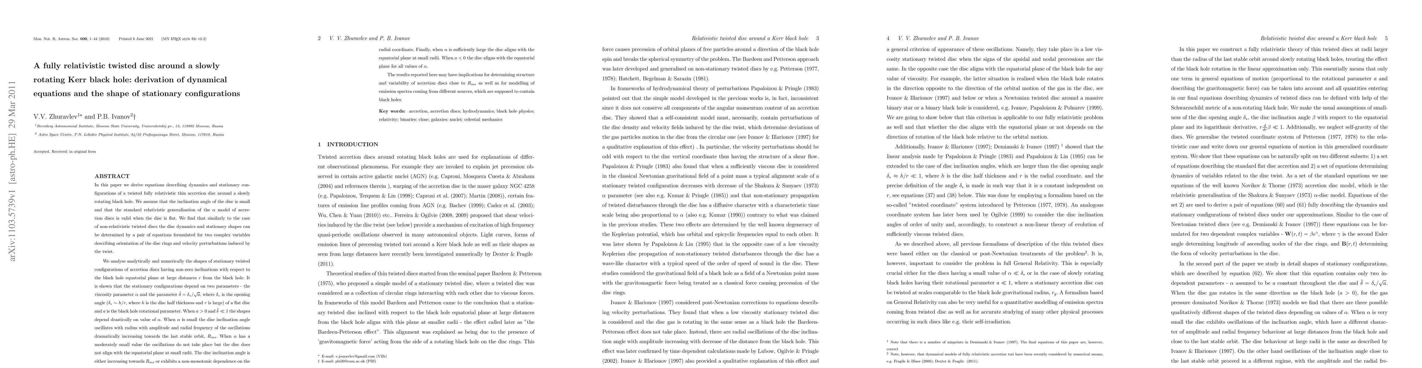 (abbreviated) In this paper we derive equations describing dynamics and stationary configurations of a twisted fully relativistic thin accretion disc around a slowly rotating black hole. We find that the disc dynamics and stationary shapes are determined by a pair of equations for two complex variables describing orientation of the disc rings and velocity perturbations in the disc. We analyse shapes of stationary twisted configurations. It is shown that the stationary configurations depend on two parameters - the $\alpha $parameter and $\tilde \delta = \delta_{*}/\sqrt a$, where $\delta_{*}\sim h/r$ is the disc opening angle (h is the disc halfthickness) and $a$ is the black hole rotational parameter. When $a > 0$ and $\tilde \delta \ll 1$ the shapes depend drastically on value of $\alpha$. When $\alpha $ is small the disc inclination angle oscillates with radius with amplitude and radial frequency of the oscillations dramatically increasing towards the last stable orbit. For moderate values of $\alpha $ the oscillations do not take place but the disc does not align with the equatorial plane at small radii. Its inclination angle is either increasing towards $R_{ms}$ or exhibits a non-monotonic dependence on the radial coordinate. Finally, when $\alpha $ is sufficiently large the disc aligns with the equatorial plane at small radii. When $a < 0$ the disc aligns with the equatorial plane for all values of $\alpha $. The results reported here may have implications for determining structure and variability of accretion discs close to $R_{ms}$ as well as for modelling of emission spectra coming from different sources, which are supposed to contain black holes.