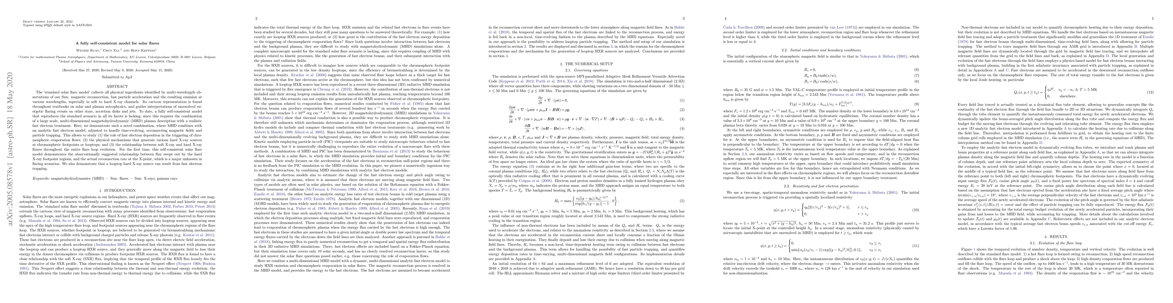 The 'standard solar' flare model collects all physical ingredients identified by multi-wavelength observations of our Sun: magnetic reconnection, fast particle acceleration and the resulting emission at various wavelengths, especially in soft to hard X-ray channels. Its cartoon representation is found throughout textbooks on solar and plasma astrophysics, and guides interpretations of unresolved energetic flaring events on other stars, accretion disks and jets. To date, a fully self-consistent model that reproduces the standard scenario in all its facets is lacking, since this requires the combination of a large scale, multi-dimensional magnetohydrodynamic (MHD) plasma description with a realistic fast electron treatment. Here, we demonstrate such a novel combination, where MHD combines with an analytic fast electron model, adjusted to handle time-evolving, reconnecting magnetic fields and particle trapping. This allows to study (1) the role of fast electron deposition in the triggering of chromospheric evaporation flows; (2) the physical mechanisms that generate various hard X-ray sources at chromospheric footpoints or looptops; and (3) the relationship between soft X-ray and hard X-ray fluxes throughout the entire flare loop evolution. For the first time, this self-consistent solar flare model demonstrates the observationally suggested relationship between flux swept out by the hard X-ray footpoint regions, and the actual reconnection rate at the X-point, which is a major unknown in flaring scenarios. We also demonstrate that a looptop hard X-ray source can result from fast electron trapping.