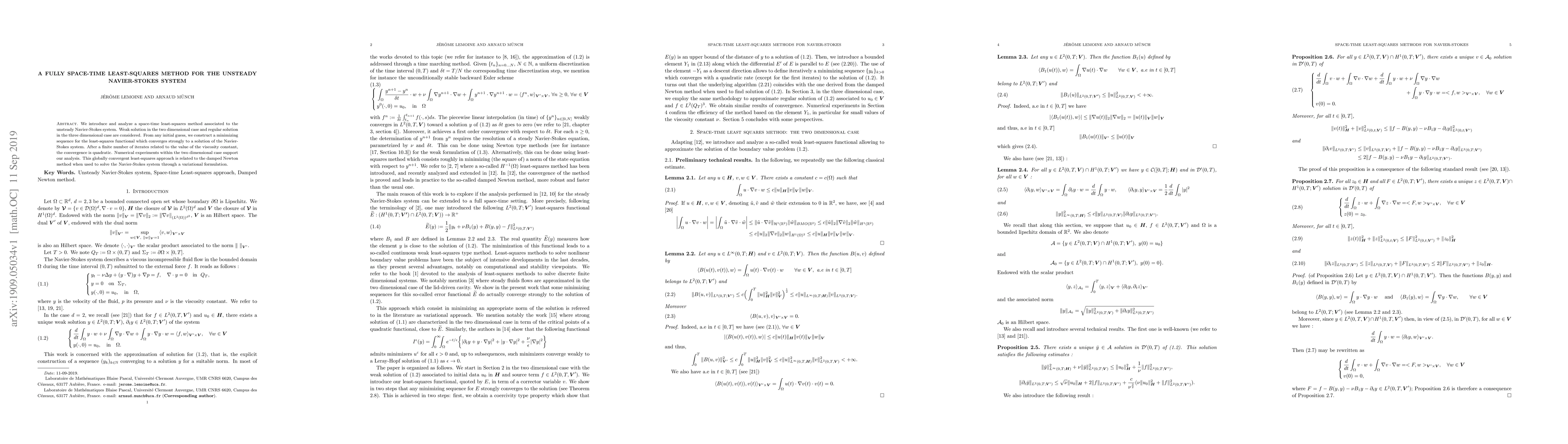 We introduce and analyze a space-time least-squares method associated to the unsteady Navier-Stokes system. Weak solution in the two dimensional case and regular solution in the three dimensional case are considered. From any initial guess, we construct a minimizing sequence for the least-squares functional which converges strongly to a solution of the Navier-Stokes system. After a finite number of iterates related to the value of the viscosity constant, the convergence is quadratic. Numerical experiments within the two dimensional case support our analysis. This globally convergent least-squares approach is related to the damped Newton method when used to solve the Navier-Stokes system through a variational formulation.