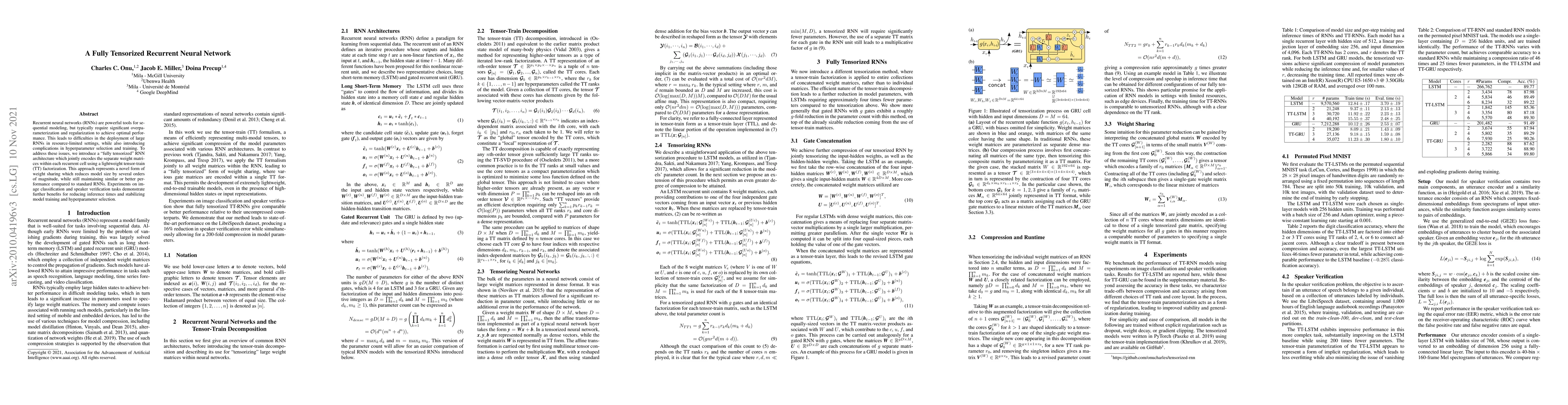 This paper proposes a "fully tensorized" RNN architecture that uses tensor-train factorization to jointly encode weight matrices, significantly reducing model size while maintaining or improving performance. Experiments show benefits in inference times and training stability for image classification and speaker verification tasks.