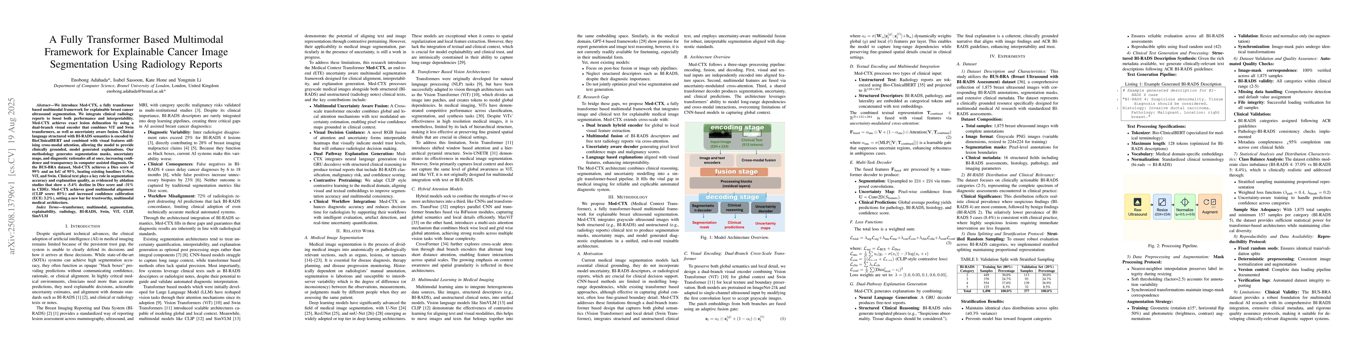 We introduce Med-CTX, a fully transformer based multimodal framework for explainable breast cancer ultrasound segmentation. We integrate clinical radiology reports to boost both performance and interpretability. Med-CTX achieves exact lesion delineation by using a dual-branch visual encoder that combines ViT and Swin transformers, as well as uncertainty aware fusion. Clinical language structured with BI-RADS semantics is encoded by BioClinicalBERT and combined with visual features utilising cross-modal attention, allowing the model to provide clinically grounded, model generated explanations. Our methodology generates segmentation masks, uncertainty maps, and diagnostic rationales all at once, increasing confidence and transparency in computer assisted diagnosis. On the BUS-BRA dataset, Med-CTX achieves a Dice score of 99% and an IoU of 95%, beating existing baselines U-Net, ViT, and Swin. Clinical text plays a key role in segmentation accuracy and explanation quality, as evidenced by ablation studies that show a -5.4% decline in Dice score and -31% in CIDEr. Med-CTX achieves good multimodal alignment (CLIP score: 85%) and increased confi dence calibration (ECE: 3.2%), setting a new bar for trustworthy, multimodal medical architecture.