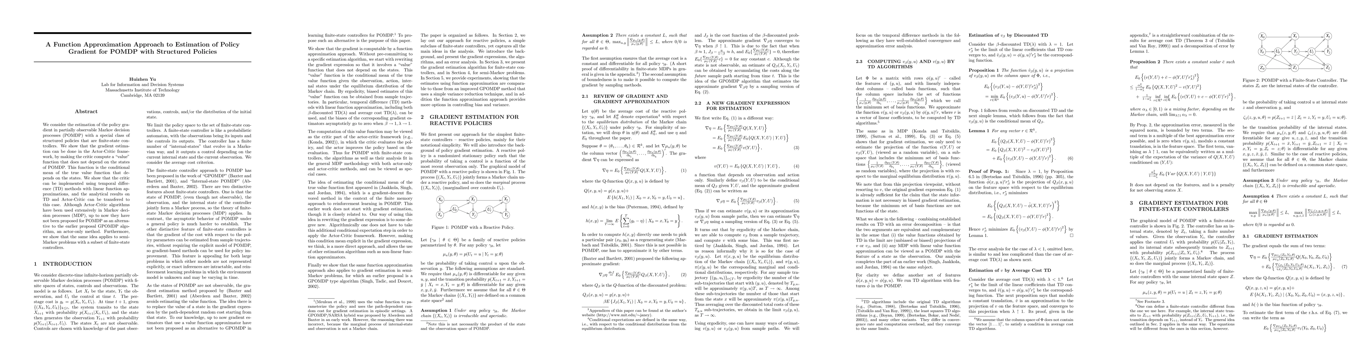 We consider the estimation of the policy gradient in partially observable Markov decision processes (POMDP) with a special class of structured policies that are finite-state controllers. We show that the gradient estimation can be done in the Actor-Critic framework, by making the critic compute a "value" function that does not depend on the states of POMDP. This function is the conditional mean of the true value function that depends on the states. We show that the critic can be implemented using temporal difference (TD) methods with linear function approximations, and the analytical results on TD and Actor-Critic can be transfered to this case. Although Actor-Critic algorithms have been used extensively in Markov decision processes (MDP), up to now they have not been proposed for POMDP as an alternative to the earlier proposal GPOMDP algorithm, an actor-only method. Furthermore, we show that the same idea applies to semi-Markov problems with a subset of finite-state controllers.