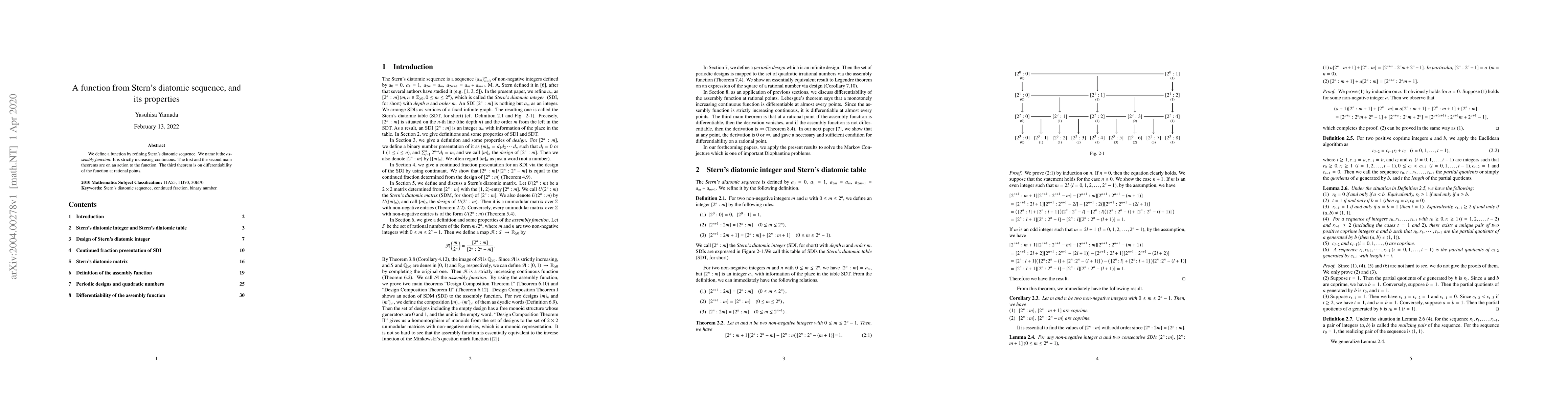 Summary: This paper defines a new function, the assembly function, derived from Stern's diatomic sequence. It proves the function's strict monotonicity, continuity, and explores its differentiability at rational points, with two main theorems detailing specific actions on the function.