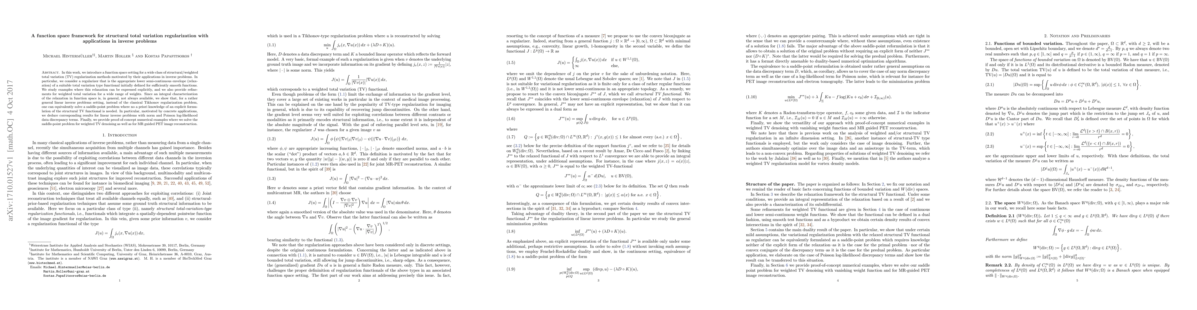 This paper introduces a function space framework for structural total variation regularization, providing relaxations of total variation functionals for inverse problems and demonstrating equivalence to solving a saddle-point problem. It applies these methods to linear inverse problems with norm and Poisson log-likelihood discrepancies, supplemented by numerical examples in image denoising and PET reconstruction.