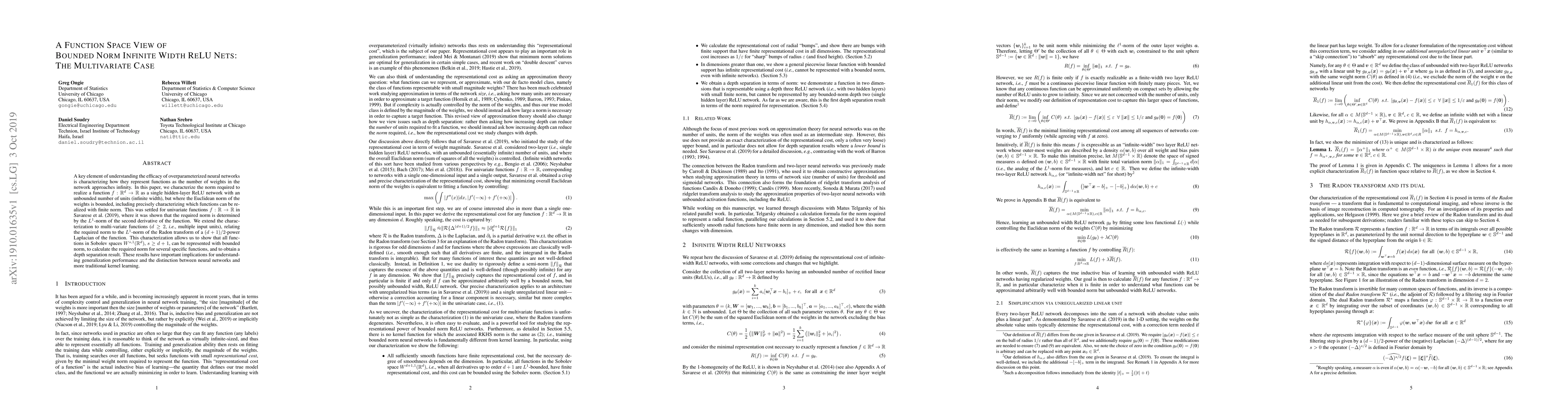 This paper extends the understanding of overparameterized neural networks by characterizing the norm needed for infinite width ReLU networks to represent multivariate functions. It relates the required norm to the L1-norm of the Radon transform of a Laplacian of the function, showing that functions in Sobolev spaces $W^{s,1}(\mathbb{R})$, $s\geq d+1$, can be represented with bounded norm.