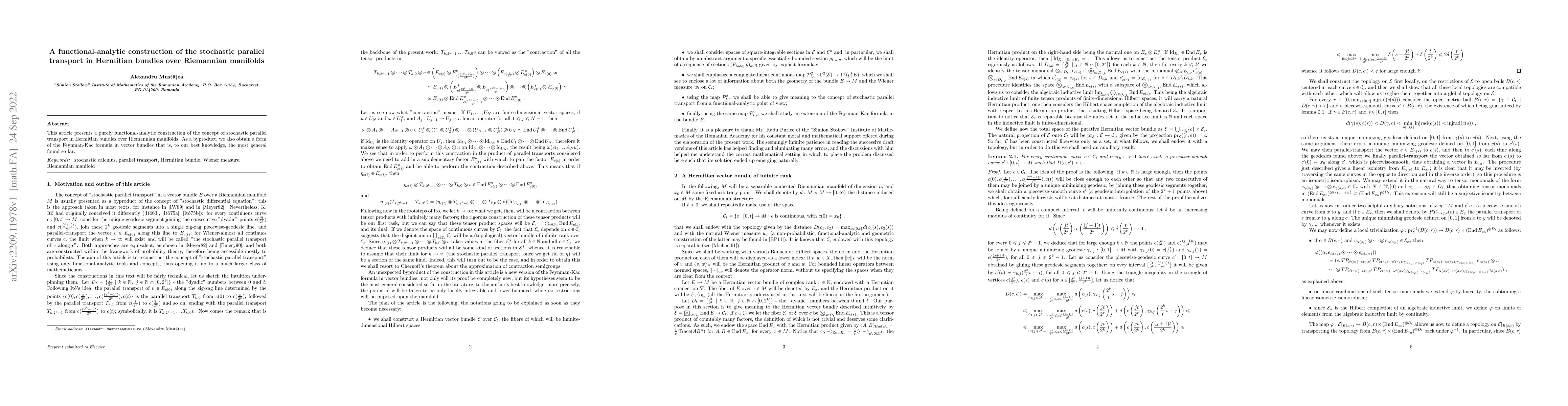 This article presents a purely functional-analytic construction of the concept of stochastic parallel transport in Hermitian bundles over Riemannian manifolds. As a byproduct, we also obtain a form of the Feynman-Kac formula in vector bundles that is, to our best knowledge, the most general found so far.