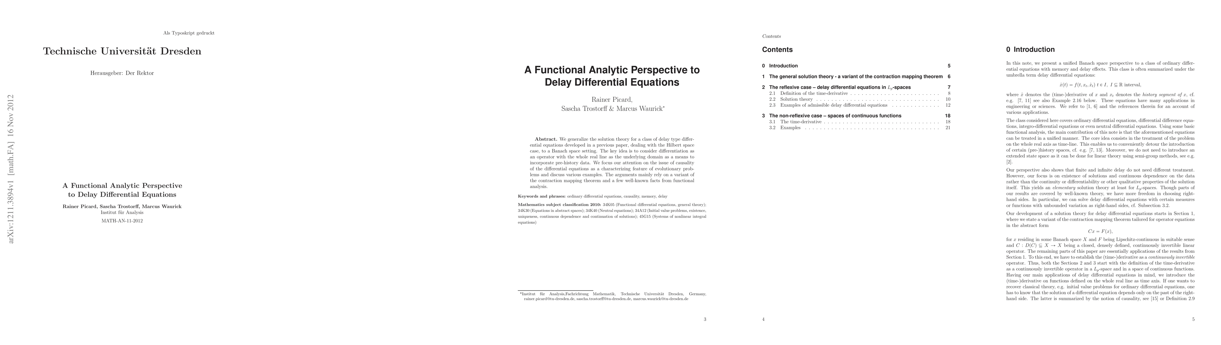 This paper extends the solution theory for delay differential equations from Hilbert to Banach spaces, emphasizing the role of differentiation as an operator to include historical data. It uses a variant of the contraction mapping theorem to address causality in evolutionary problems, supported by functional analysis principles.