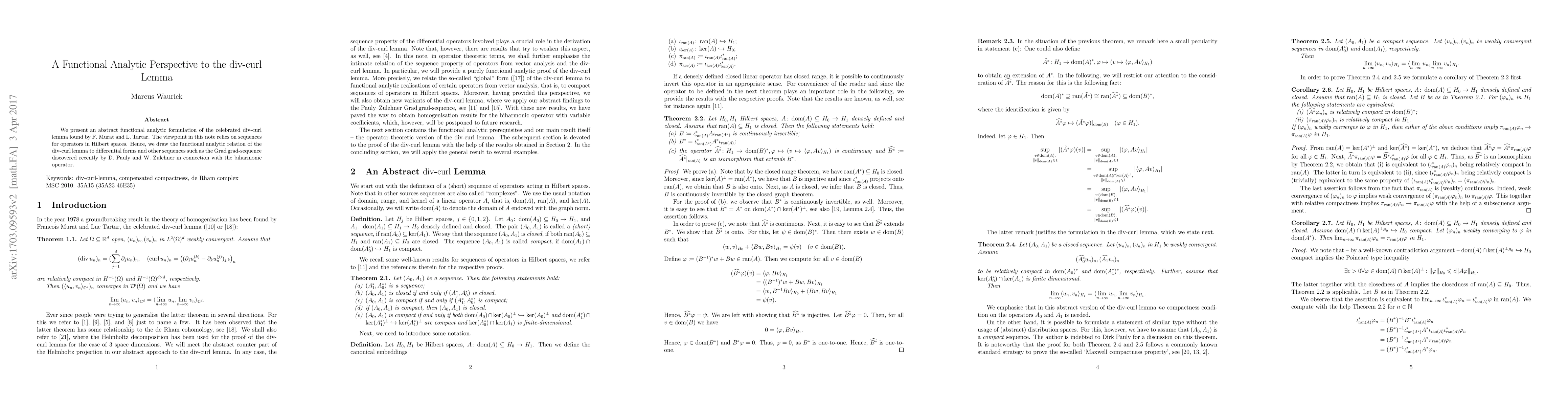 We present an abstract functional analytic formulation of the celebrated $\dive$-$\curl$ lemma found by F.~Murat and L.~Tartar. The viewpoint in this note relies on sequences for operators in Hilbert spaces. Hence, we draw the functional analytic relation of the div-curl lemma to differential forms and other sequences such as the $\Grad\grad$-sequence discovered recently by D.~Pauly and W.~Zulehner in connection with the biharmonic operator.