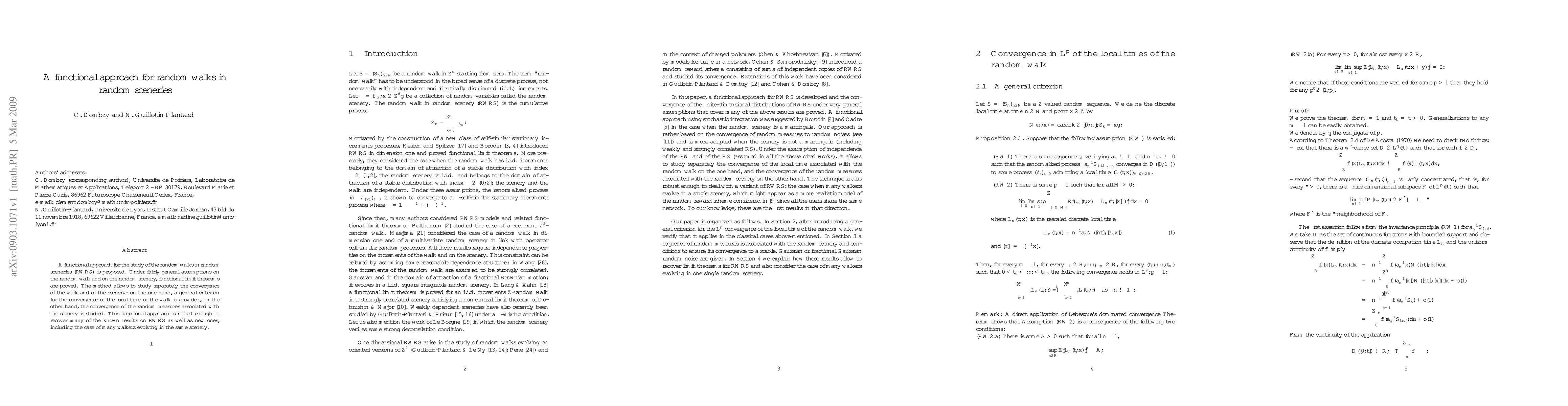 This paper proposes a functional approach to study random walks in random sceneries, proving functional limit theorems under general assumptions. The method separately analyzes the convergence of the walk and the scenery, providing a criterion for the local time convergence and studying the convergence of random measures associated with the scenery.