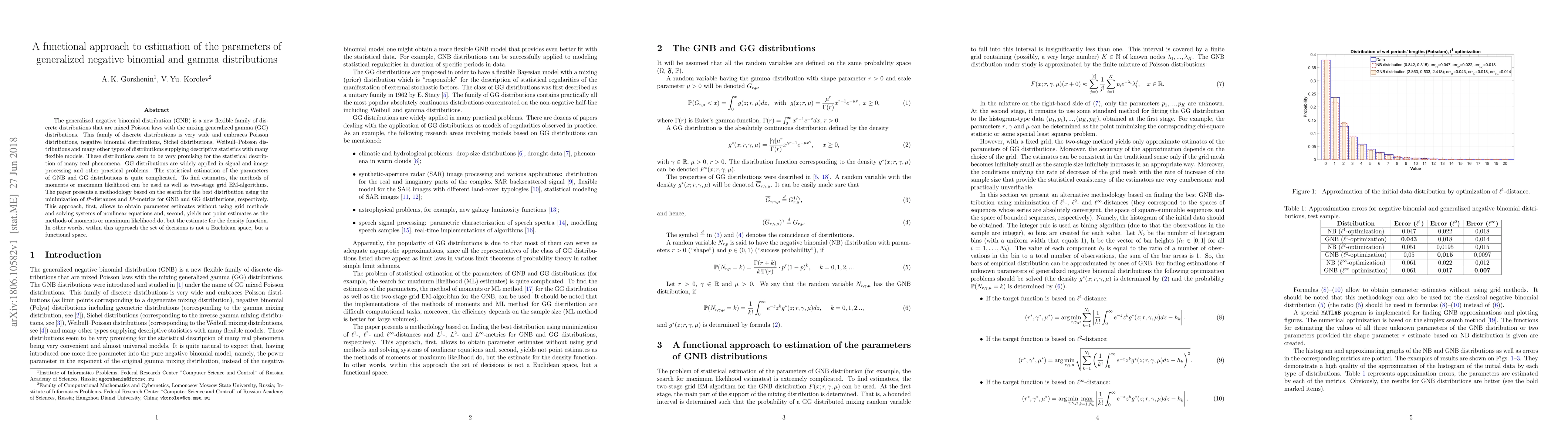 This paper proposes a functional approach for estimating parameters of generalized negative binomial (GNB) and generalized gamma (GG) distributions, utilizing $\ell^p$-distances and $L^p$-metrics. Unlike traditional methods, this approach provides estimates for the density function rather than point estimates, operating within a functional space instead of a Euclidean space.