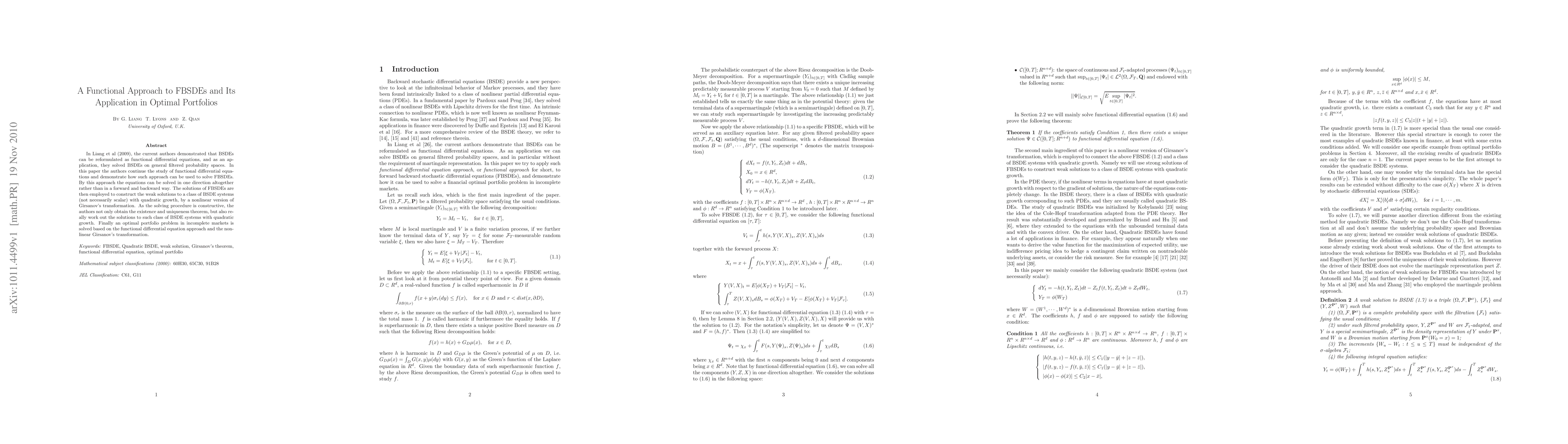 In Liang et al (2009), the current authors demonstrated that BSDEs can be reformulated as functional differential equations, and as an application, they solved BSDEs on general filtered probability spaces. In this paper the authors continue the study of functional differential equations and demonstrate how such approach can be used to solve FBSDEs. By this approach the equations can be solved in one direction altogether rather than in a forward and backward way. The solutions of FBSDEs are then employed to construct the weak solutions to a class of BSDE systems (not necessarily scalar) with quadratic growth, by a nonlinear version of Girsanov's transformation. As the solving procedure is constructive, the authors not only obtain the existence and uniqueness theorem, but also really work out the solutions to such class of BSDE systems with quadratic growth. Finally an optimal portfolio problem in incomplete markets is solved based on the functional differential equation approach and the nonlinear Girsanov's transformation.