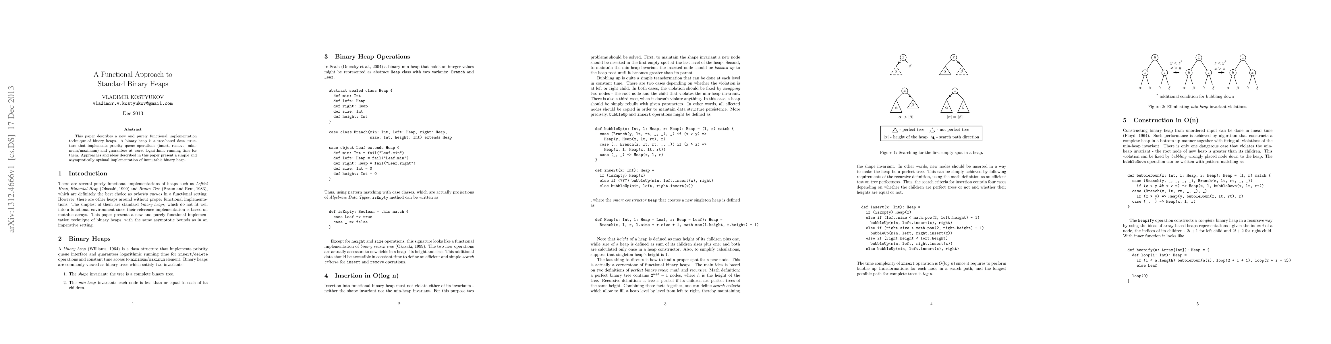 This paper describes a new and purely functional implementation technique of binary heaps. A binary heap is a tree-based data structure that implements priority queue operations (insert, remove, minimum/maximum) and guarantees at worst logarithmic running time for them. Approaches and ideas described in this paper present a simple and asymptotically optimal implementation of immutable binary heap.