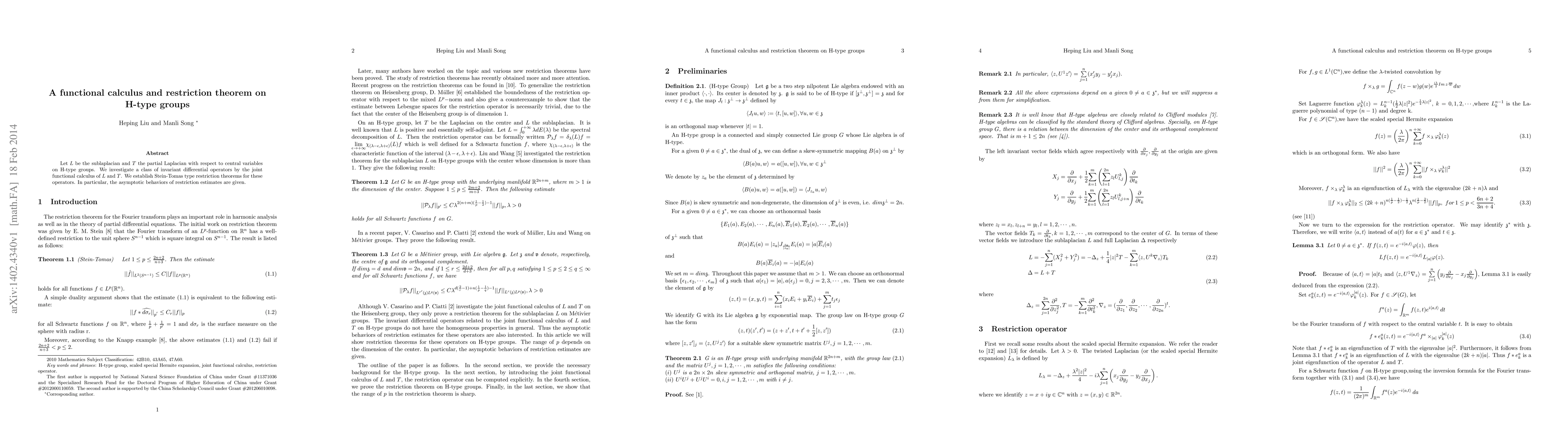 This paper explores invariant differential operators on H-type groups using a joint functional calculus of the sublaplacian and partial Laplacian. It establishes Stein-Tomas type restriction theorems and provides asymptotic behavior for these restriction estimates.