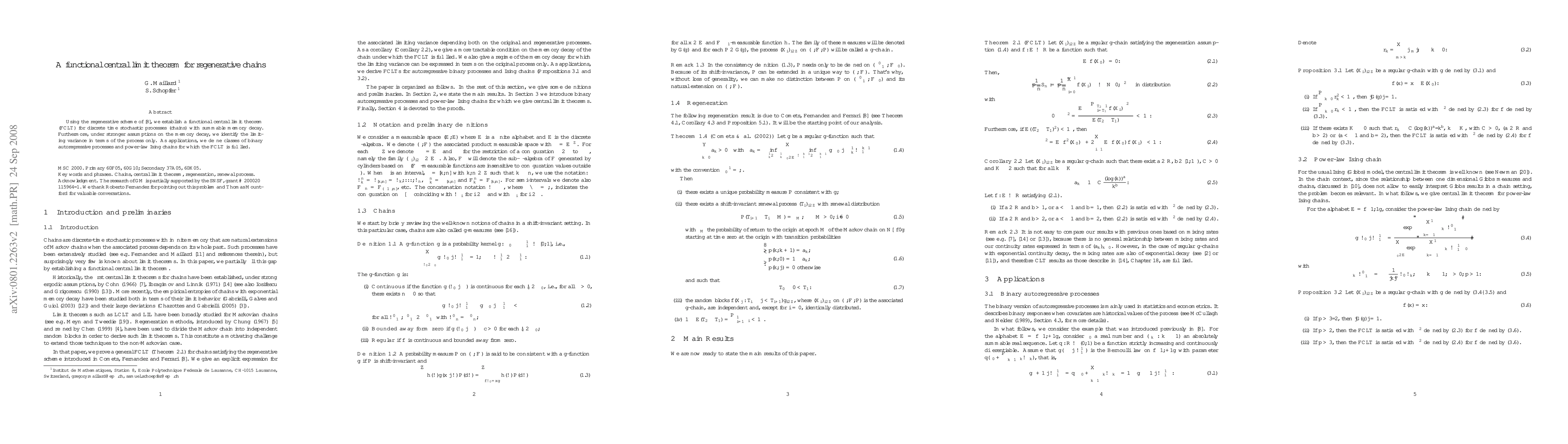 This paper establishes a functional central limit theorem for regenerative chains with summable memory decay, identifying the limiting variance under stronger assumptions. It applies the theorem to binary autoregressive processes and power-law Ising chains.