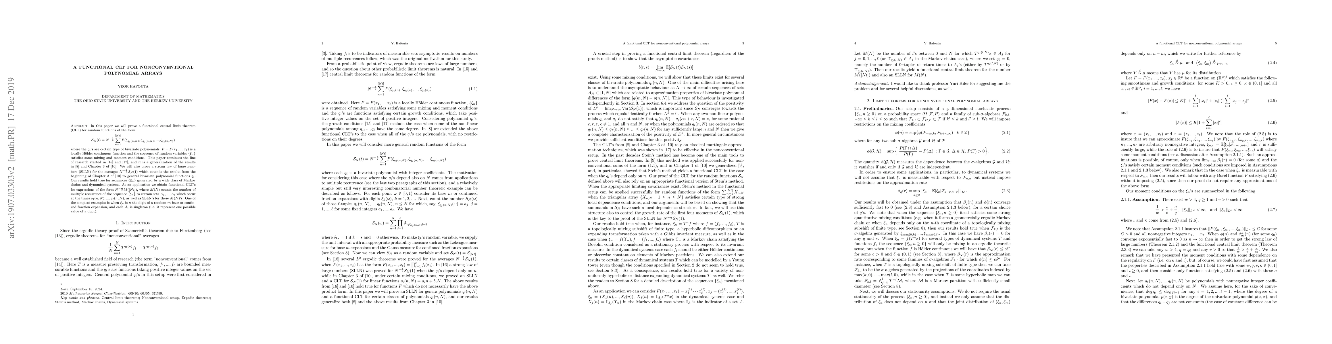 In this paper we will prove a functional central limit theorems for "nonconventional" sums indexed by polynomial arrays.