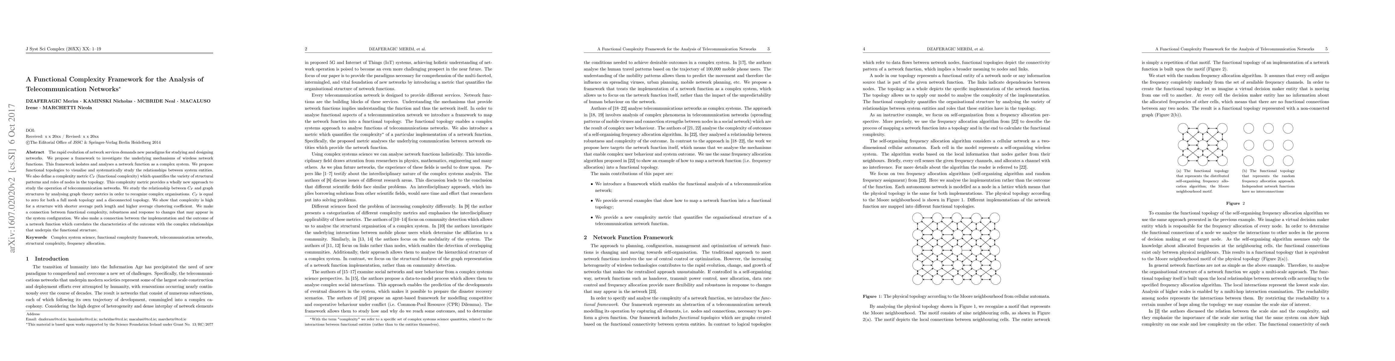 The rapid evolution of network services demands new paradigms for studying and designing networks. In order to understand the underlying mechanisms that provide network functions, we propose a framework which enables the functional analysis of telecommunication networks. This framework allows us to isolate and analyse a network function as a complex system. We propose functional topologies to visualise the relationships between system entities and enable the systematic study of interactions between them. We also define a complexity metric $C_F$ (functional complexity) which quantifies the variety of structural patterns and roles of nodes in the topology. This complexity metric provides a wholly new approach to study the operation of telecommunication networks. We study the relationship between $C_F$ and different graph structures by analysing graph theory metrics in order to recognize complex organisations. $C_F$ is equal to zero for both a full mesh topology and a disconnected topology. We show that complexity is very high for a dense structure that shows high integration (shorter average path length and high average clustering coefficient). We make a connection between functional complexity, robustness and response to changes that may appear in the system configuration. We also make a connection between the implementation and the outcome of a network function which correlates the characteristics of the outcome with the complex relationships that underpin the functional structure.