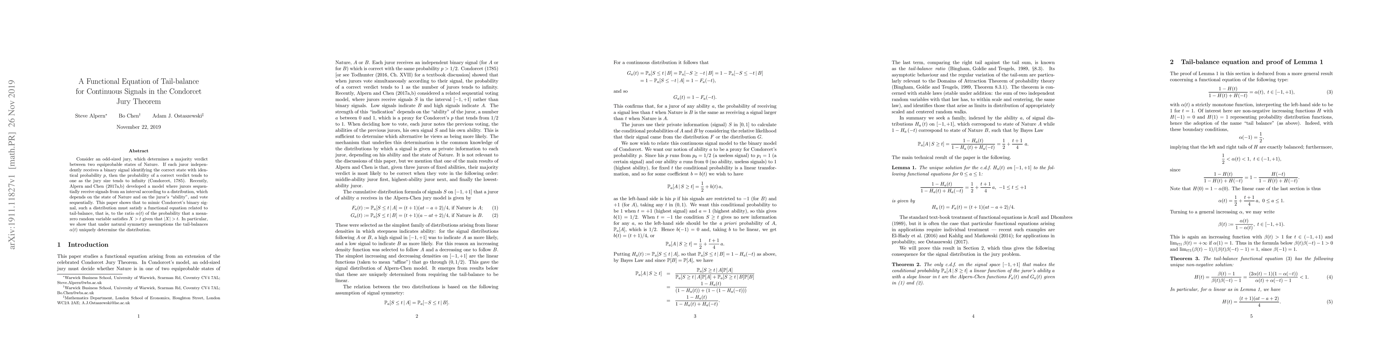 This paper explores a functional equation for tail-balance in the context of continuous signals in the Condorcet Jury Theorem, demonstrating that the distribution of signals received by jurors must satisfy a specific functional equation to replicate the binary signal model. Under symmetry assumptions, these tail-balances uniquely determine the distribution.