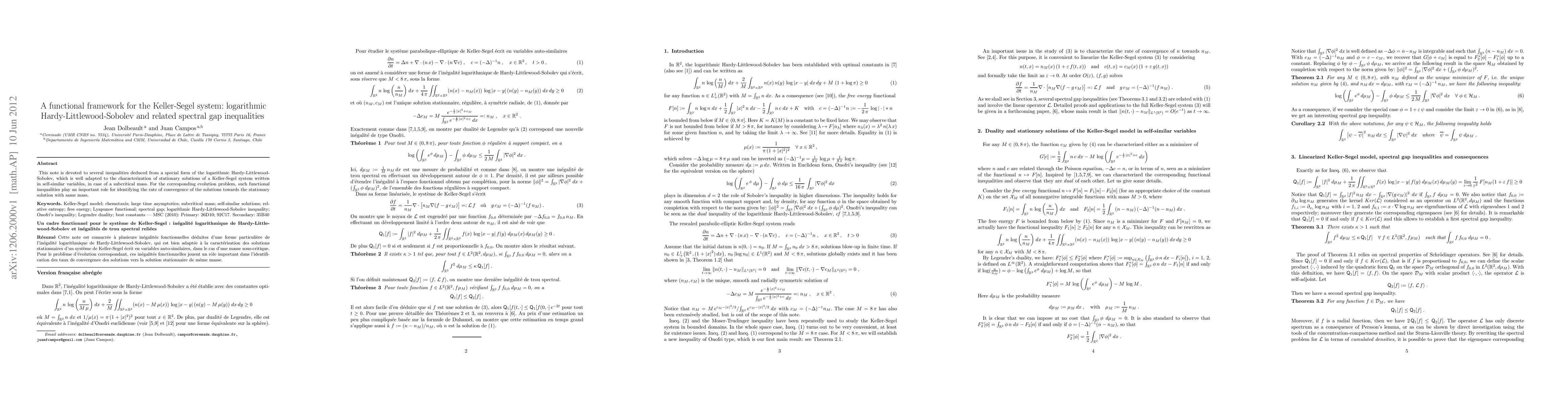 This paper develops functional inequalities derived from the logarithmic Hardy-Littlewood-Sobolev inequality to characterize stationary solutions of the Keller-Segel system under subcritical mass conditions, and uses these to determine the convergence rate of evolving solutions towards the stationary state.