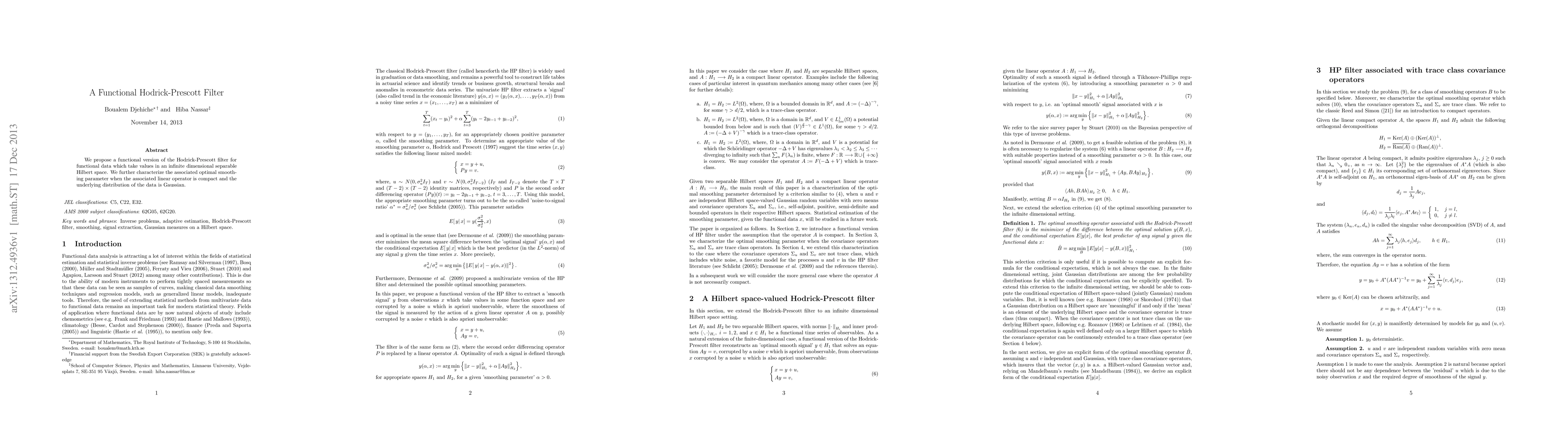 This paper introduces a functional Hodrick-Prescott filter for infinite-dimensional data, characterizing the optimal smoothing parameter under Gaussian data distribution and compact linear operators. The method aims to smooth functional data effectively.