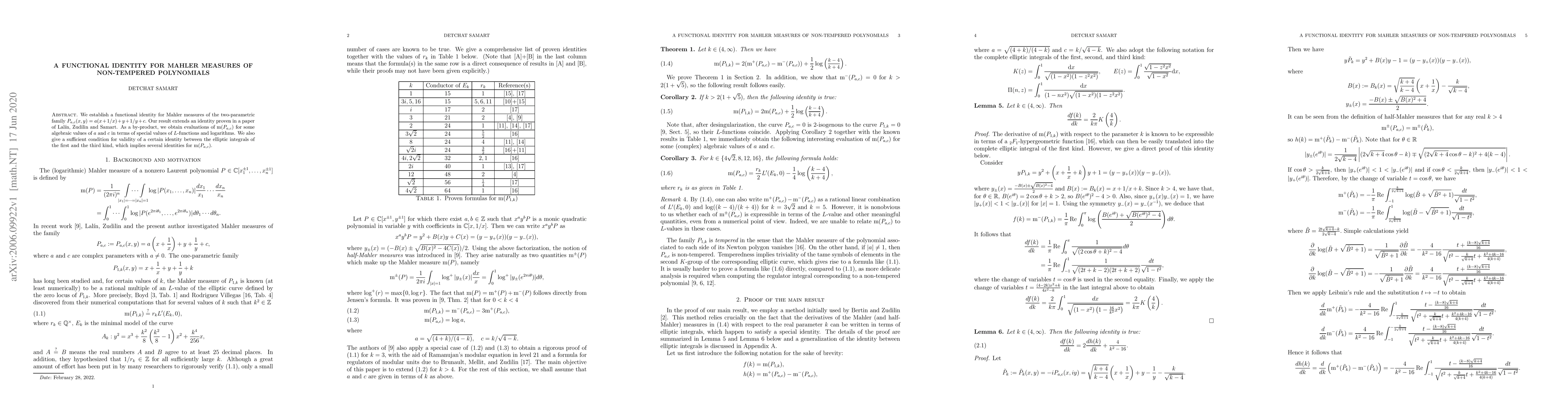 This paper establishes a functional identity for Mahler measures of the two-parametric family $P_{a,c}(x,y)$, extending previous results. It also evaluates $m(P_{a,c})$ for specific algebraic values of $a$ and $c$ in terms of $L$-functions and logarithms, and provides a condition for identities between elliptic integrals.