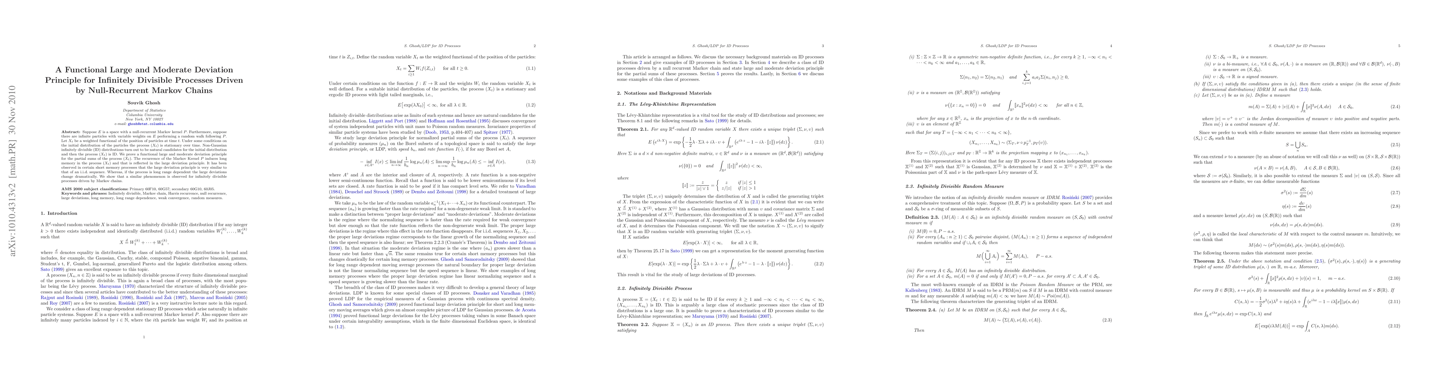 Suppose $ E$ is a space with a null-recurrent Markov kernel $ P$. Furthermore, suppose there are infinite particles with variable weights on $ E$ performing a random walk following $ P$. Let $ X_{t}$ be a weighted functional of the position of particles at time $ t$. Under some conditions on the initial distribution of the particles the process $ (X_{t})$ is stationary over time. Non-Gaussian infinitely divisible (ID) distributions turn out to be natural candidates for the initial distribution and then the process $ (X_{t})$ is ID. We prove a functional large and moderate deviation principle for the partial sums of the process $ (X_{t})$. The recurrence of the Markov Kernel $ P$ induces long memory in the process $ (X_{t})$ and that is reflected in the large deviation principle. It has been observed in certain short memory processes that the large deviation principle is very similar to that of an i.i.d. sequence. Whereas, if the process is long range dependent the large deviations change dramatically. We show that a similar phenomenon is observed for infinitely divisible processes driven by Markov chains. Processes of the form of $ (X_{t})$ gives us a rich class of non-Gaussian long memory models which may be useful in practice.