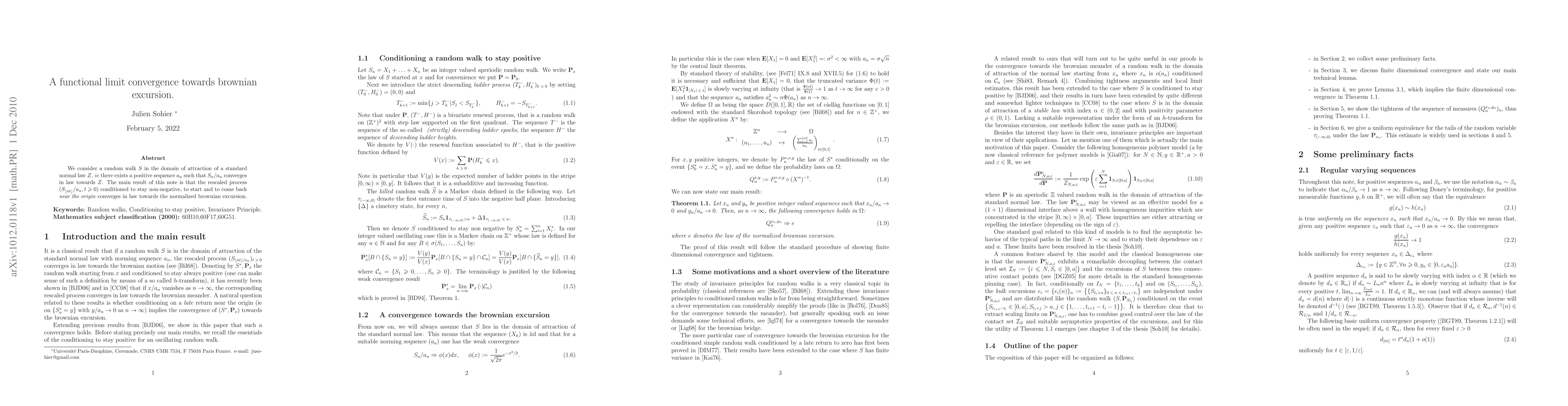 We consider a random walk $S$ in the domain of attraction of a standard normal law $Z$, \textit{ie} there exists a positive sequence $a_n$ such that $S_n/a_n$ converges in law towards $Z$. The main result of this note is that the rescaled process $(S_{\lfloor nt \rfloor}/a_n, t \geq 0)$ conditioned to stay non-negative, to start and to come back \textit{near the origin} converges in law towards the normalized brownian excursion.