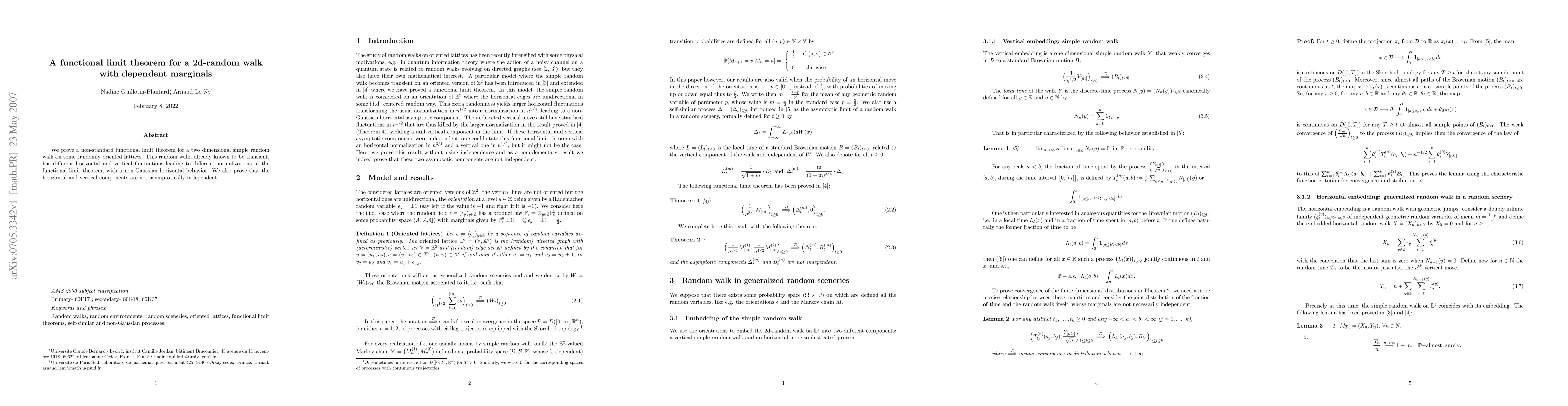 Researchers prove a non-standard functional limit theorem for a 2D random walk on randomly oriented lattices, showing the horizontal and vertical components are not asymptotically independent and have different normalizations.