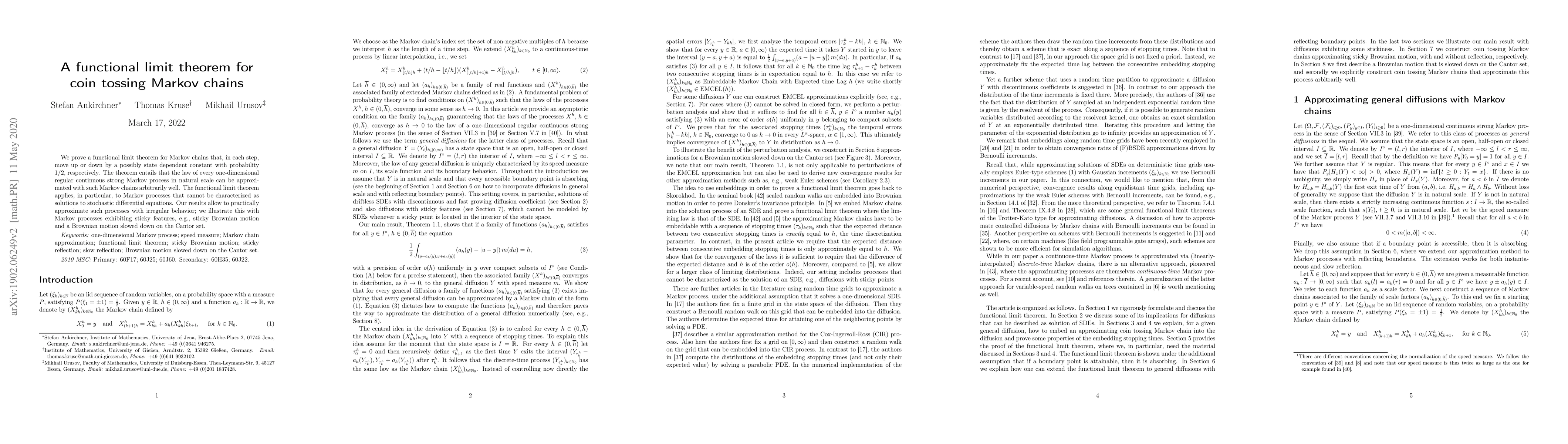 This paper proves a functional limit theorem for Markov chains that move up or down by a state-dependent constant with equal probability, showing they can approximate one-dimensional regular continuous strong Markov processes. The theorem extends to processes like sticky Brownian motion, enabling practical approximations of irregular Markov processes.