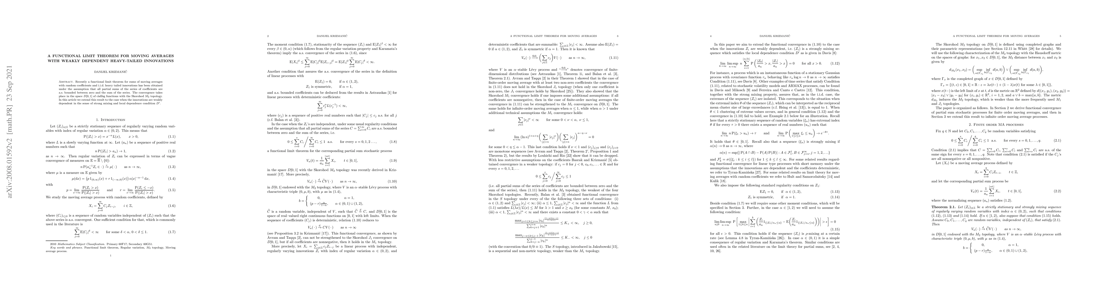 This paper extends a functional limit theorem for moving averages with i.i.d. heavy-tailed innovations to the case where innovations are weakly dependent, satisfying strong mixing and local dependence conditions. The convergence occurs in the Skorohod $M_{2}$ topology for $D[0,1]$ functions.