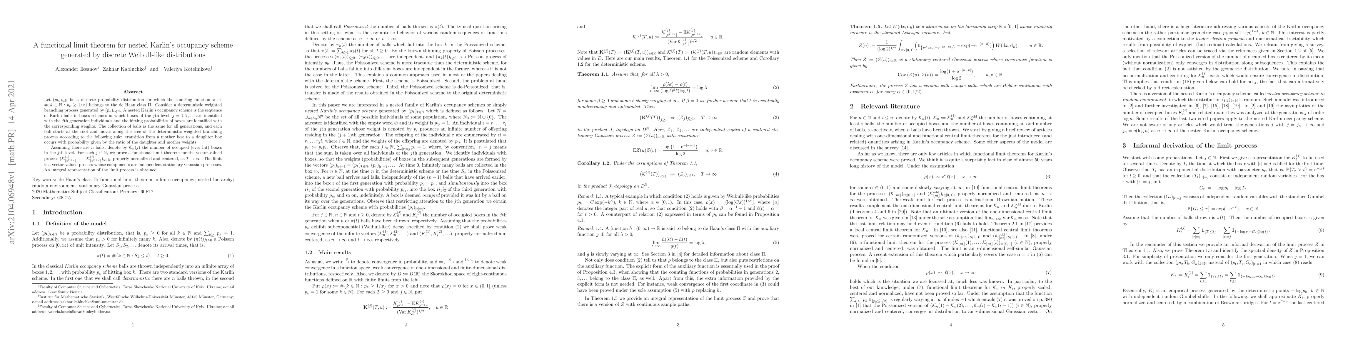 This paper proves a functional limit theorem for a nested Karlin's occupancy scheme generated by a deterministic weighted branching process with discrete Weibull-like distributions. The limit is a vector-valued process of independent stationary Gaussian processes.